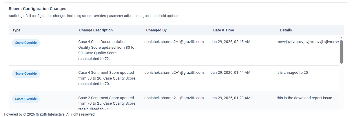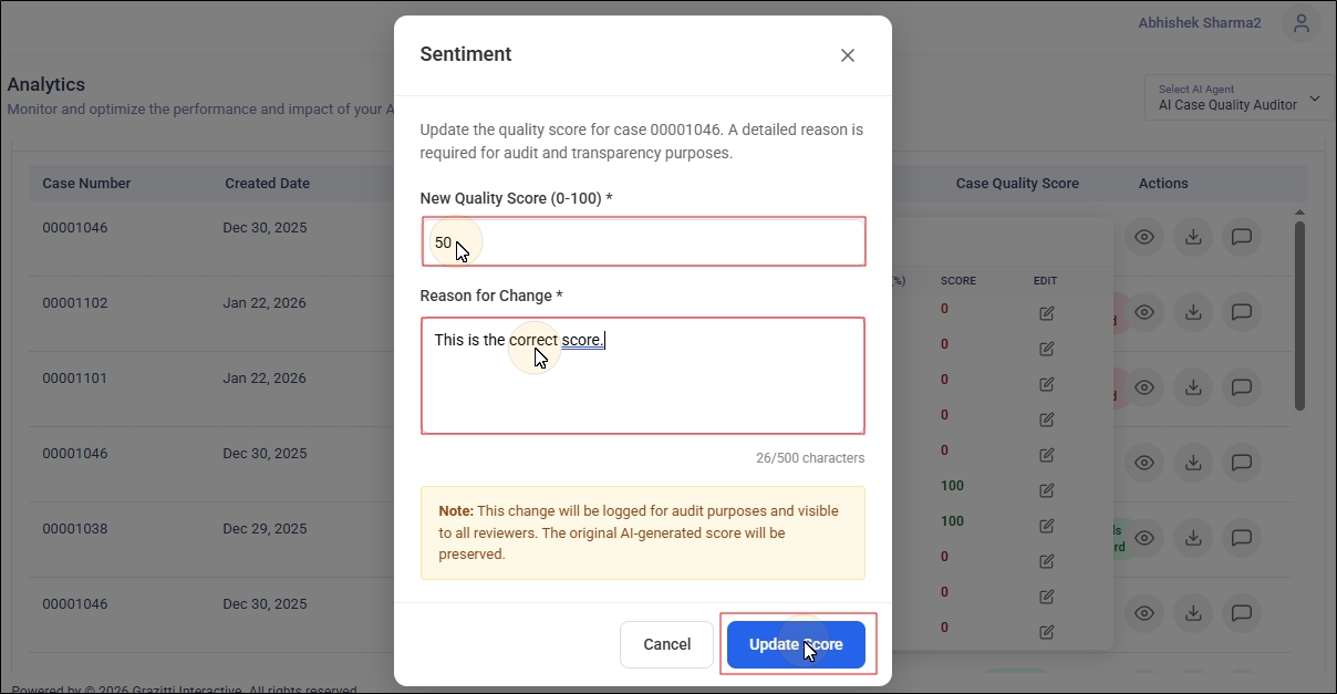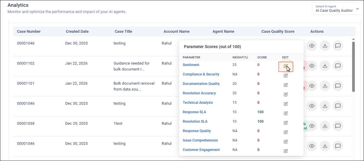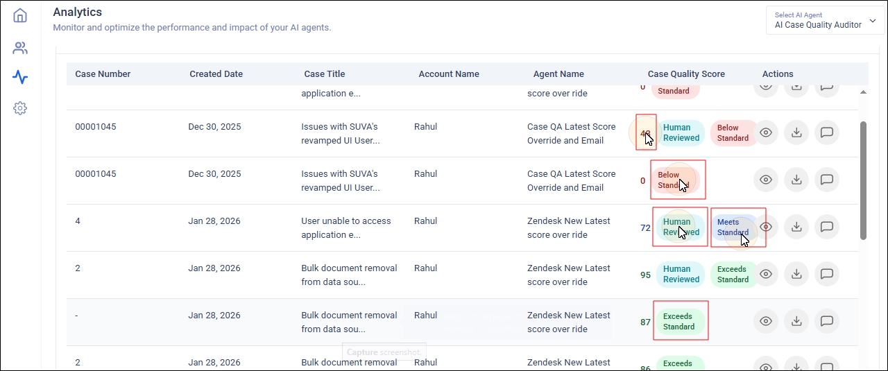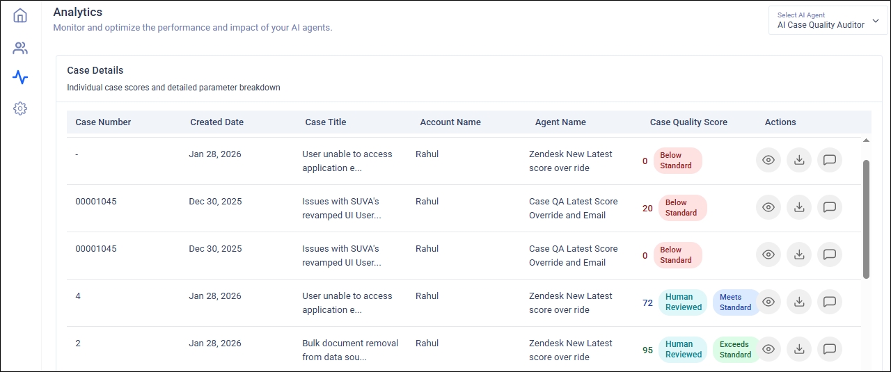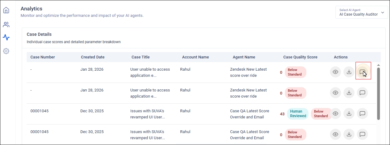 You can override AI-generated quality scores for individual cases using the Eye Icon in the Actions column. The feature allows you to record a detailed reason to ensure accurate scoring, maintain transparency. This feature is an essential safeguard to ensure fairness, accuracy, and transparency in customer support quality audits. Automated scoring systems can sometimes misinterpret real-world complexities, where the agent does everything right and still gets unfairly penalized.