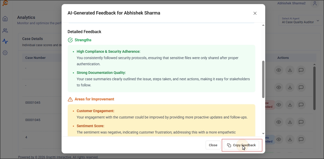 After a case has been closed, the Case Quality Auditor produces consistent and structured "AI-Generated Feedback" reports for the agent. Each feedback report is specific to each closed case. Each report contains actionable items. Support managers can save a lot of time by reading the AI-generated feedback instead of writing each feedback manually.