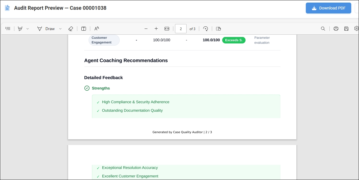 Support Managers, QA Managers, and Customer Success Managers complete Case Quality Audit Reports as a PDF files. The PDF reports help the managers later on take decisions on where to: