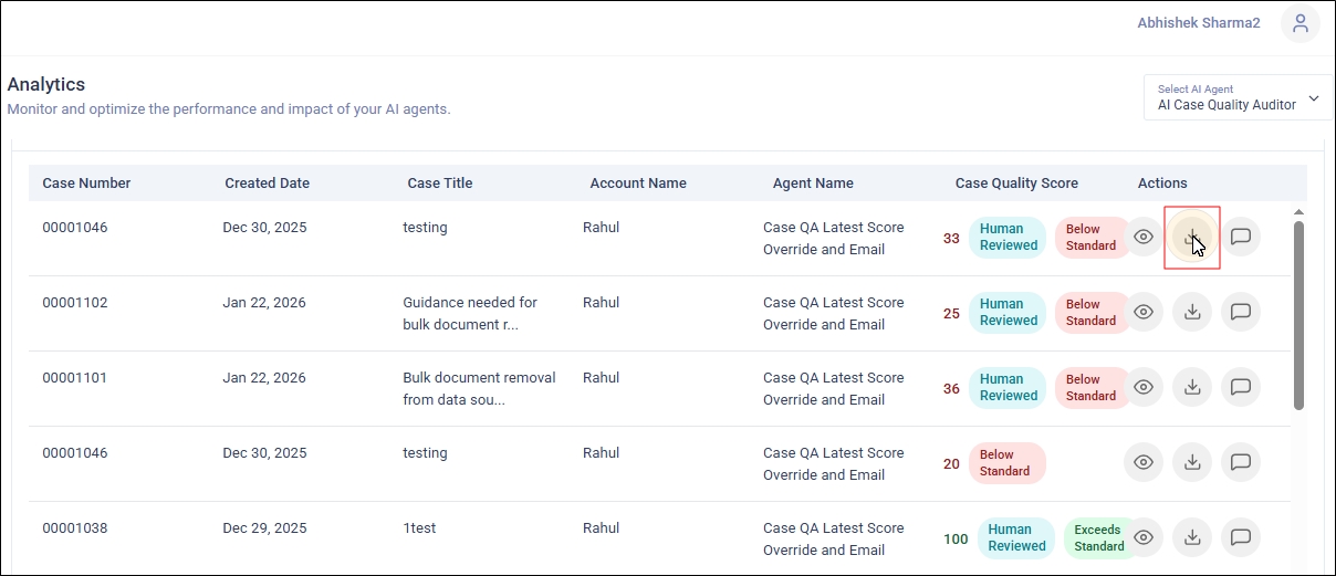 To view the analytics reports for the Case Quality Auditor, go to Analytics and select AI Case Quality Auditor from the Select AI Agent dropdown.