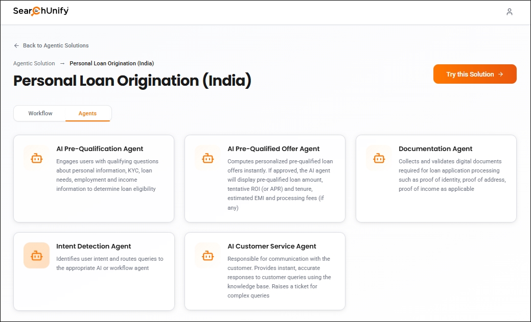 Fig. A snapshot of the five agents available in Agentic Solution for Personal Loan Origination .