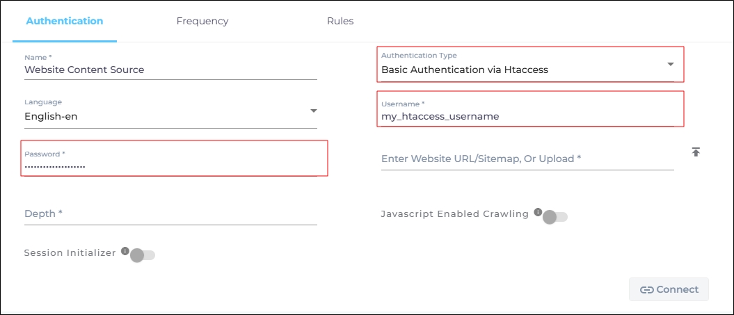 To use Htaccess to authenticate your content source, first select Basic Authentication via Htaccess, then enter the following details:
