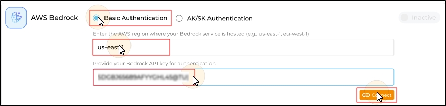 After successfully establishing a connection you can switch the authentication type. However, switching the authentication type will remove all the saved details, disable the AWS Bedrock integration, and disable the SearchUnifyGPT toggle in Search Clients > Configurations, if the toggle is active. After switching, enter the required details again to activate AWS Bedrock.