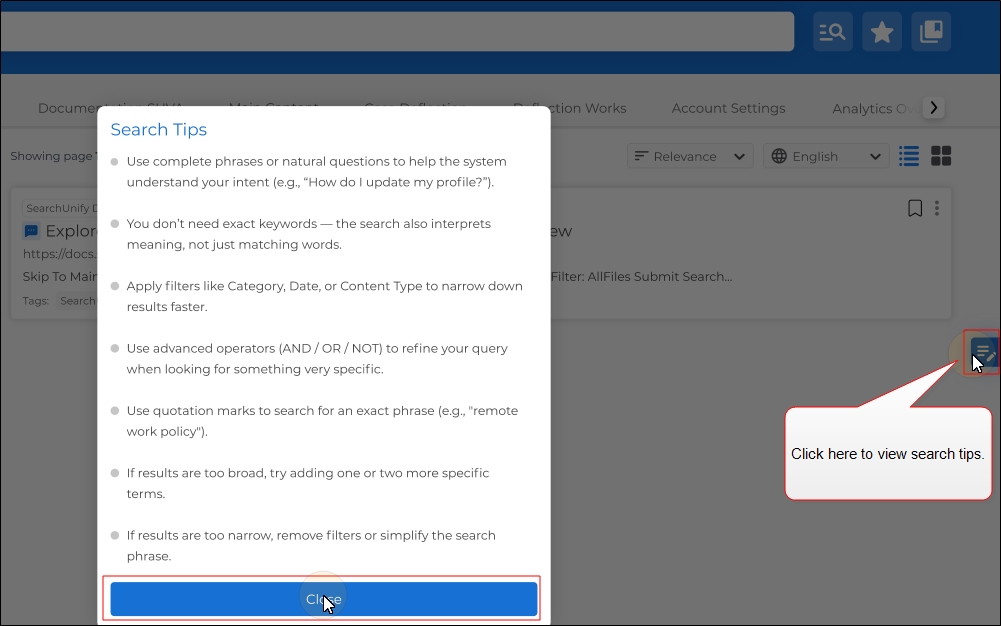 The tips that help users search efficiently in the Hybrid Search mode are different from the tips that help them search efficiently in the traditional search mode. To reflect this change, Search Tips has been made dynamic. The users will see an updated set of search tips if Hybrid Search is turned on in your SearchUnify instance. The new tips will help users make the most of the Hybrid Search mode. Essentially: