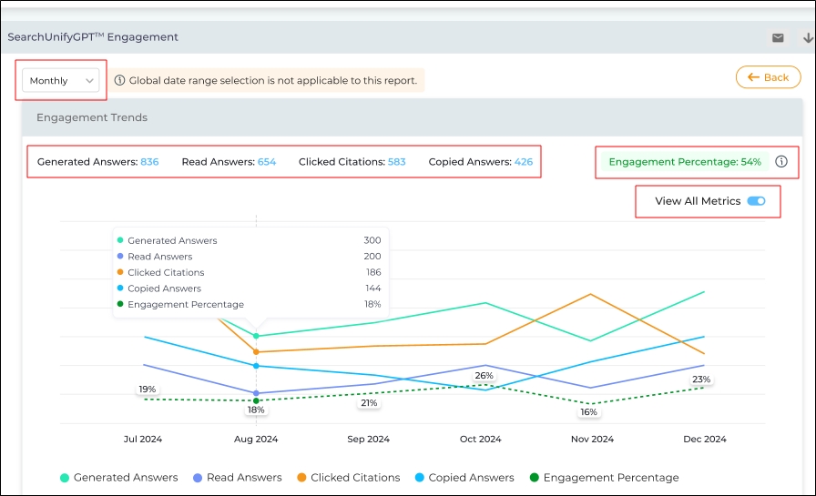 A new sub-report Engagement Trends has been introduced in the SearchUnifyGPT Engagement report to provide long-term user engagement patterns for the answers generated by SearchUnifyGPT. The report displays the user engagement with answers, citations, and the copy function over a month or a quarter. You can view up to five metrics or only the Engagement Percentage for a month or a quarter using the View All Metrics toggle.