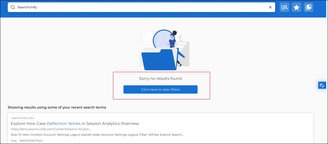 The Click Here to Clear Results button no longer appears when a search query—rather than a filter—causes the search client to fail in finding results. The search client cannot locate any relevant results under the following two conditions: