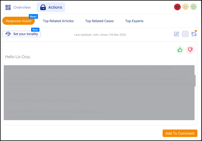Agent Helper now lets support agents post Response Assist text directly to Salesforce Case Comments using the Add to Comment action. Once posted, the Case Timeline refreshes immediately to show the latest comment—reducing the need to switch to Salesforce for updates.