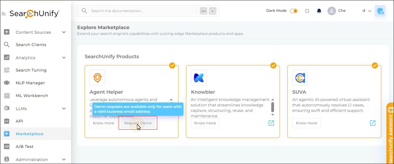 The Dark Mode toggle in the SearchUnify Menu Bar has been deprecated and is no longer available in the admin panel. The Dark Mode button will disappear in the admin panels after a client upgrades their instance to Q1 ‘26.