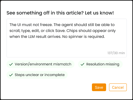 Agent Helper now streamlines negative feedback collection with a lightweight Thumbs Down popup across all AI outputs. Agents can submit free-text feedback (minimum 30 valid characters). Agent Helper uses an LLM to infer the likely reason(s) and displays up to three informational chips when confidence is below a specified threshold.