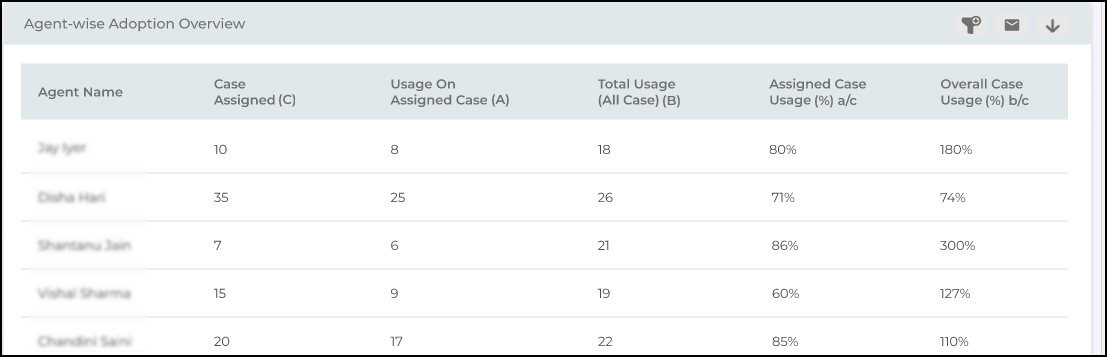 The Agent-wise Adoption Overview report displays how individual agents use key Agent Helper features across their caseloads, helping managers spot power users, uncover low adoption, and prioritize targeted coaching to drive consistent feature usage across the team.