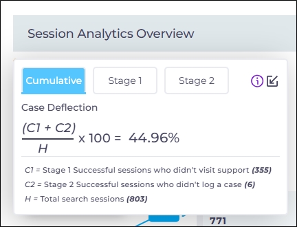 Cumulative Case Deflection is the sum of stage 1 case deflection and stage 2 case deflection divided by the total session. The metric gives you a comprehensive status of self-service on your platform.