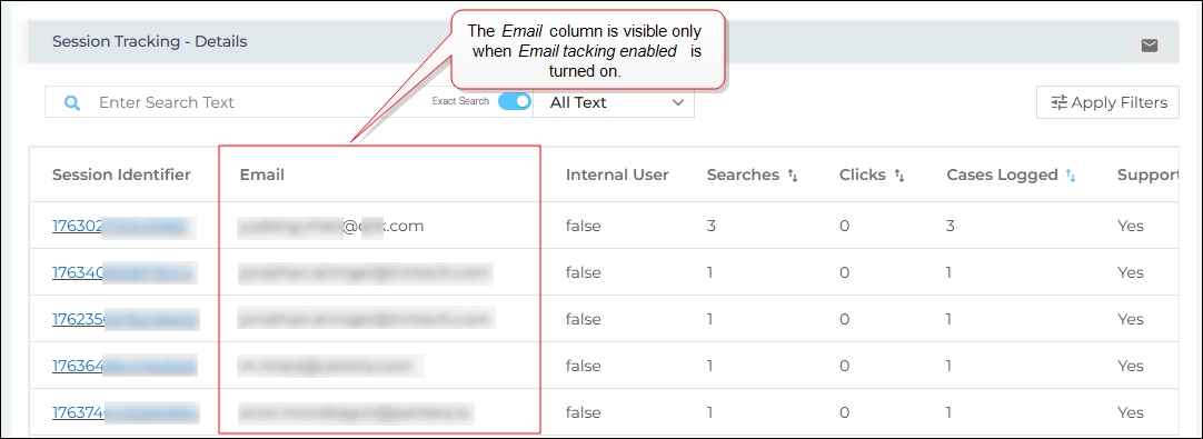 The Email tacking enabled setting in Search Clients > Edit > Analytics Settings > Analytics Properties allows you to determine whether user email IDs are displayed in the Session Tracking Details report.