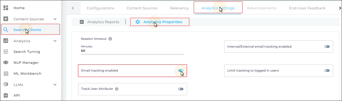 Navigate to Search Clients > Edit > Analytics Settings > Analytics Properties.