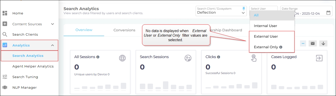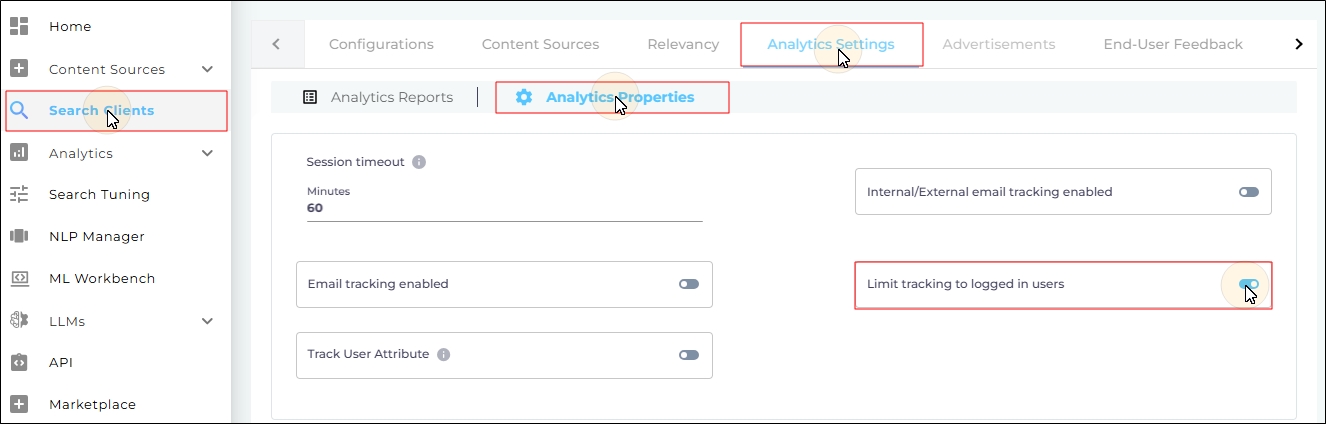 The Limit tracking to logged in users setting in Search Clients > Edit > Analytics Settings > Analytics Properties allows you to collect Search Analytics data exclusively for Internal Users. When this configuration is enabled, the Search User filter in Search Analytics will show no data for the External User or External-Only filter values.