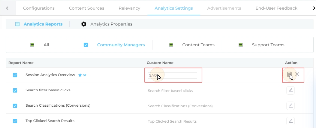 To quickly set up analytics, select the category that best matches your role. You can customize your selection by picking reports individually. For example, after selecting Community Managers, you can remove or add specific reports as needed. You can read about what each analytics report is capable of in Search Analytics.