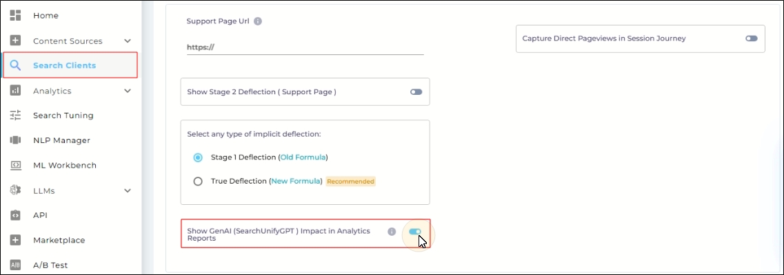 The Show GenAI (SearchUnifyGPTâ˘) Impact in Analytics Reports setting in in Search Clients > Edit > Analytics Settings > Analytics Properties allows you to view the impact of SearchUnifyGPTâ˘-generated answers in deflecting cases. Turning it on impacts two reports: