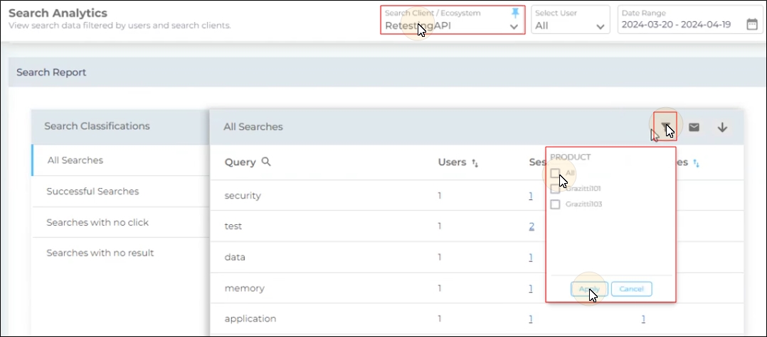 Choose one or more variable values and click Apply. Note that only one variable with a maximum of 100 values is supported for each search client.