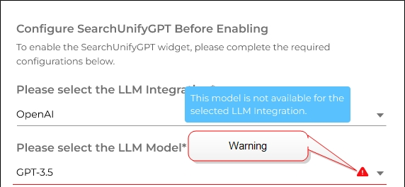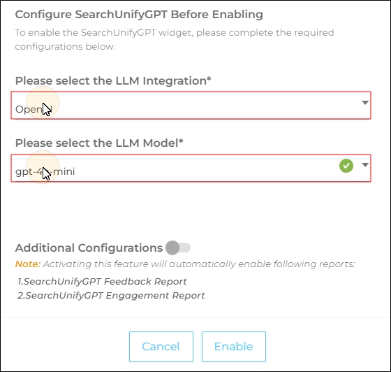 If you haven't done it, then first connect SearchUnify to a Large Language Model (LLM) such as OpenAI and then follow the following steps. The instructions to connect SearchUnify with a third-party LLM are in Configure LLM Integrations.