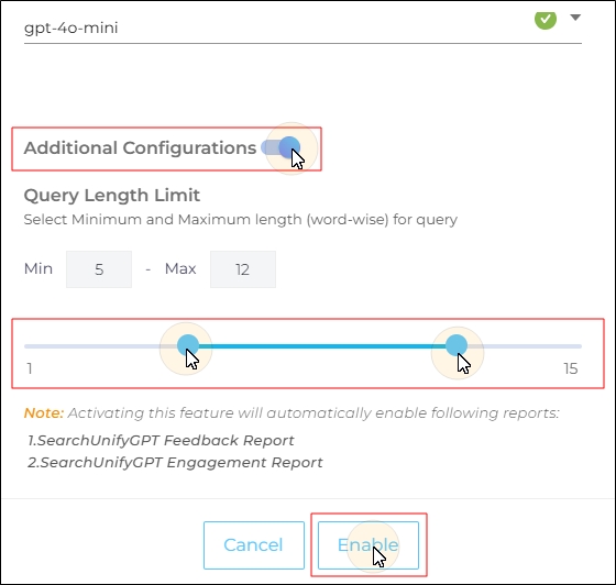 Scroll down to enable Additional Configurations. In this section, you’ll find the Query Length Limit configuration, which allows admins to define when SearchUnifyGPT™ should be triggered.