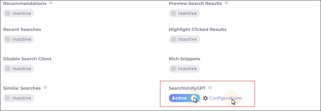 Toggle SearchUnifyGPT™ to ON in the Configurations tab.