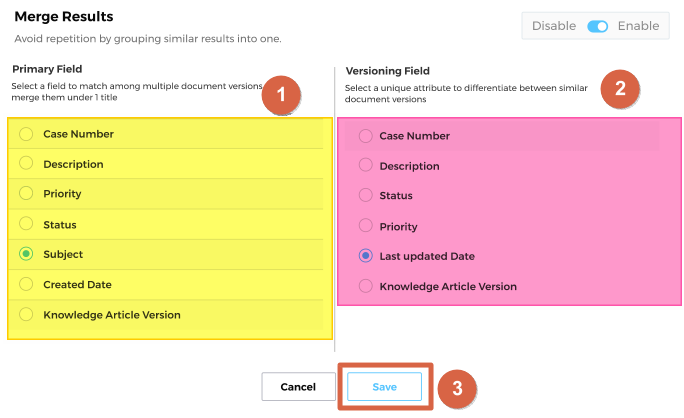 Merge Results works for searches with results. SearchUnify admins configure it by selecting two properties of an object:
