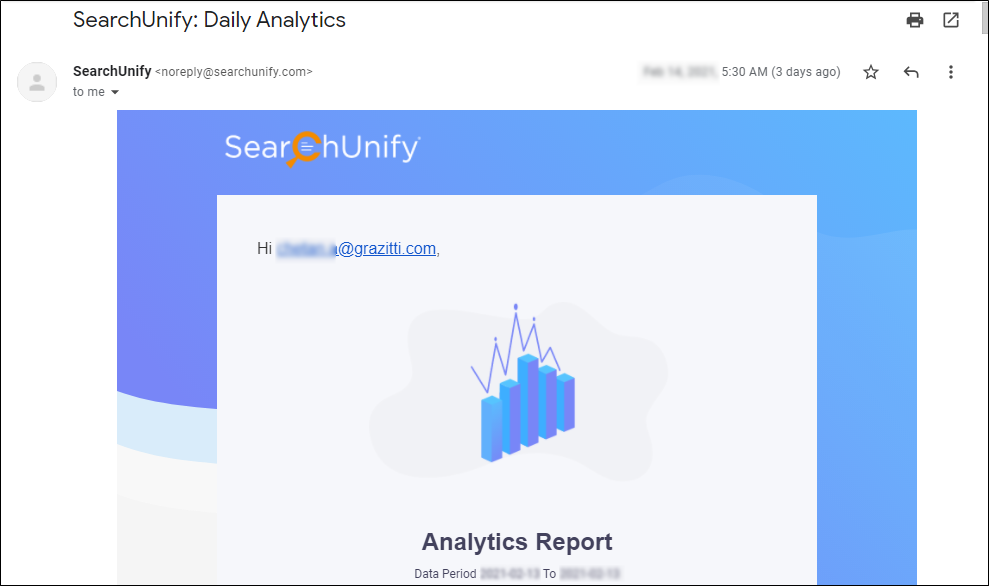 Receive analytics reports right in your mailbox. You can share analytics data with stakeholders without creating new SearchUnify users. Each report is sent from noreply@searchunify.com with SearchUnify: {{Data Period}} Analytics in the subject line. The time for which data is compiled is called Data Period and can be daily, weekly, or monthly.