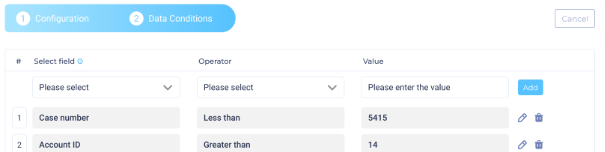 You will now land on Data Conditions. It is optional but you can use this to further refine training data. For instance, in the next image you can see the settings if your goal is to train Agent Helper only on cases whose account ID series is less than 5415 and Account ID is greater than 14.