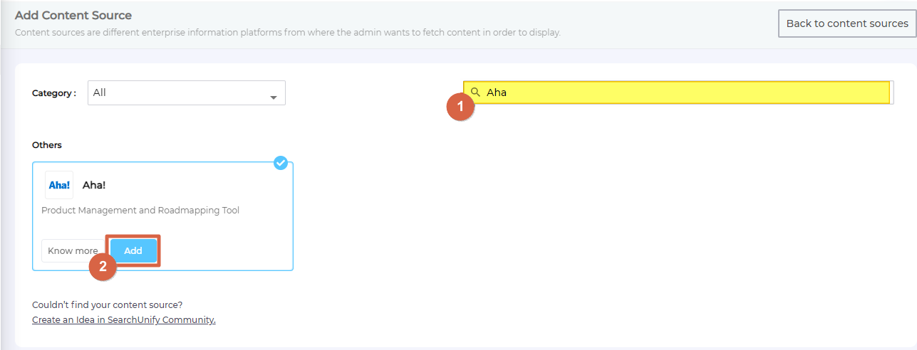 SearchUnify can index the sole Aha! content type, idea. You can select idea fields for indexing in By Content Type. For instance, you can crawl and index only titles and authors. By Projects allows you to index the ideas linked with selected projects.