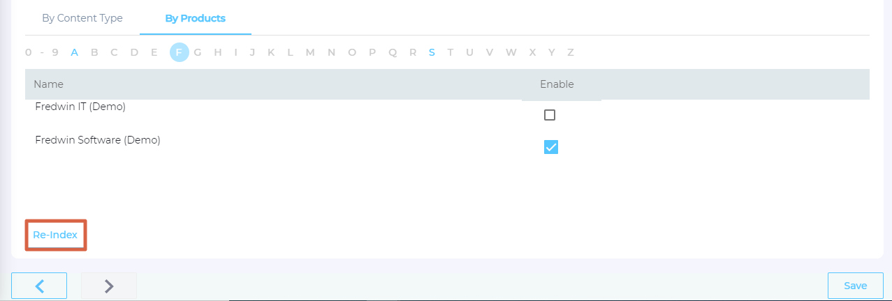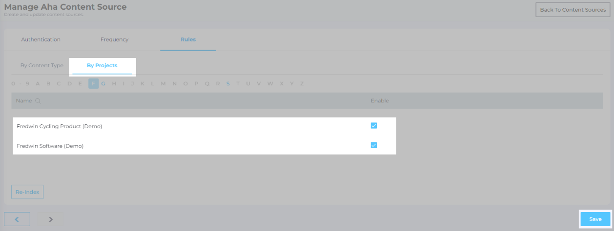 to select ideafields for indexing. - On moving to By Projects, check projects. In the next image, projects "Fredwin Cycling Product (Demo)" and" Fredwin Software (Demo)" have been selected. The ideas linked to both projects will be indexed. Then, click Save.