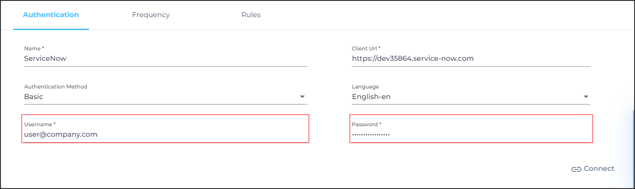 If you selected Basic, enter your ServiceNow instance Username and Password.