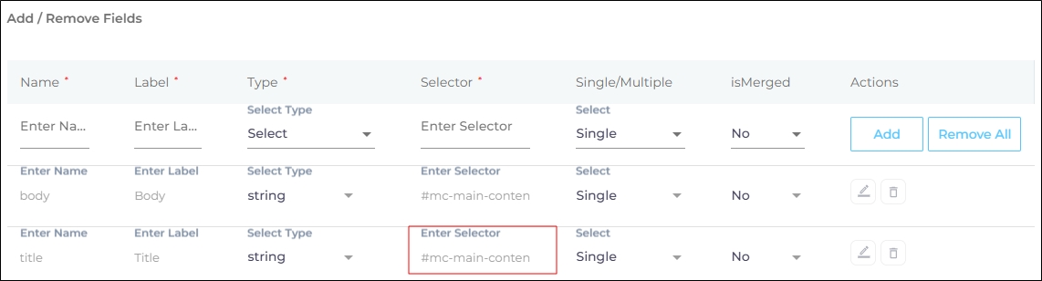 Selector is the most important field. It's used to find content for indexing. On a webpage, all HTML tags, classes, and IDs are valid selectors.