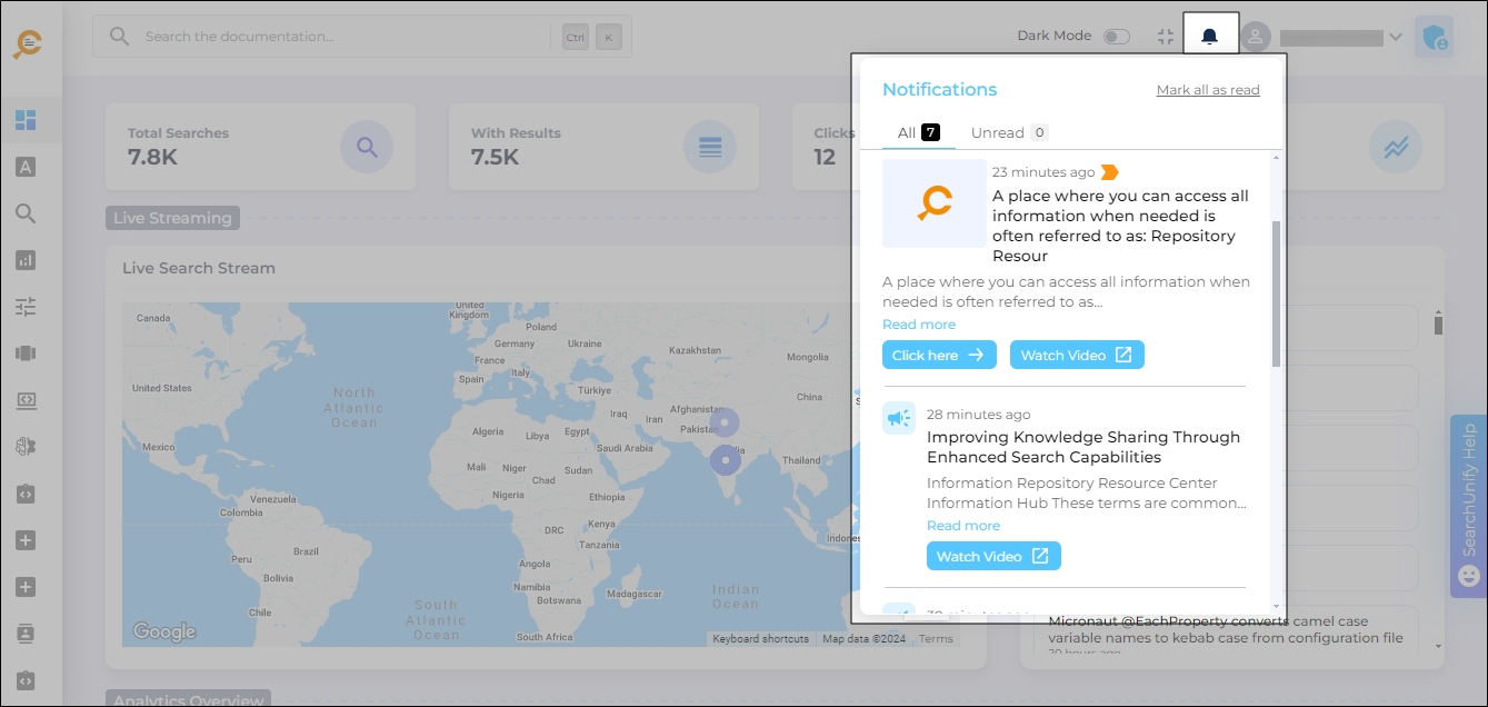 Each time a new SearchUnify release is announced, a message pops up in your instance. Each message is about a new feature. You can immediately read it by clicking Click to View or save it for reading later by clicking
