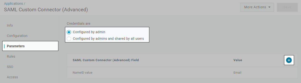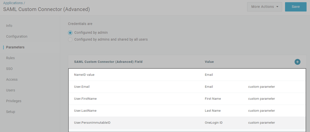 , add three more fields: User.LastName, User.Email, and User.PersonImmutableID. Give them values Last Name, Email, and OneLogin ID. In the end, the Parameters screen should resemble the following image. -