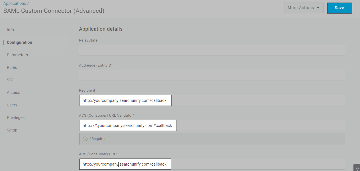 ACS (Consumer) URL. Enter {{base URL}}/callback, where {{base URL}} is your SearchUnify instance.
