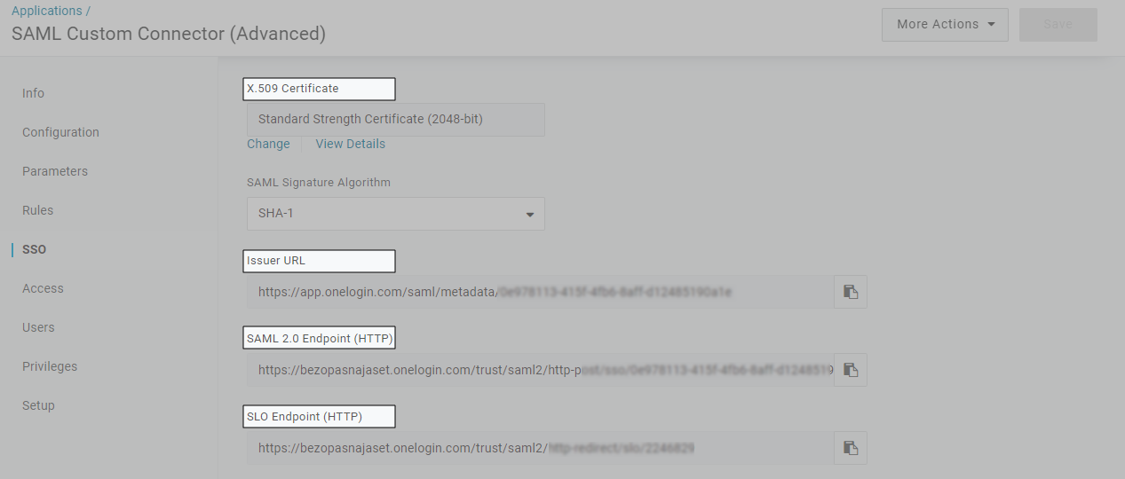 Move to SSO. Copy X.509 Certificate, Issuer URL, SAML 2.0 Endpoint (HTTP), and SLO Endpoint (HTTP).