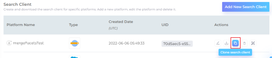 Before cloning, ensure that you have the search client to be cloned. Refer to Add a Search Client to learn how to create a search client from scratch.
