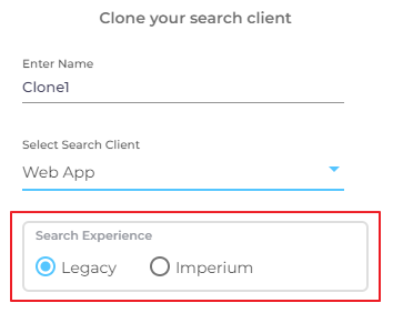 When cloning a web search client, such as Website, Drupal, and WordPress, you can choose between two experiences: Legacy and Imperium.
