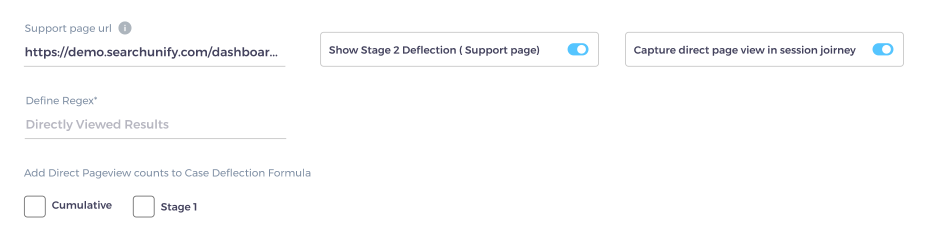 3. Capture direct page view in session journey and Define regex are related. The default definition of case deflection in SearchUnify is a session in which a user searches then clicks (stage one deflection) but never logs a ticket (state two deflection). Although important, search isn't the only way to discover content. Sometimes a user finds links to what he is looking for from an email, a social media post, or a chat message. If the content helps him and he doesn't log a case, then your content was helpful to him. You can capture such scenarios by turning on direct page views and defining the content pages in Define regex.