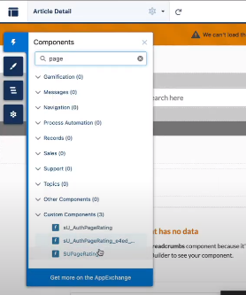 Navigate to Components and search for sU_AuthPageRating_{1234}, where {1234} represents the first four digits of your search client UID. Then, drag it to your Article Detail page.