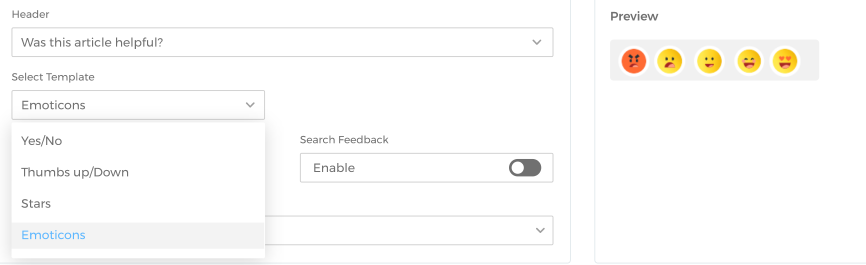 Four templates are available: Yes or No, Thumbs up/Down, Stars, and Emoticons. The template is shown next to the header. Admins can insert custom headers, sub-headers, and acknowledgments. The custom values can be removed anytime.