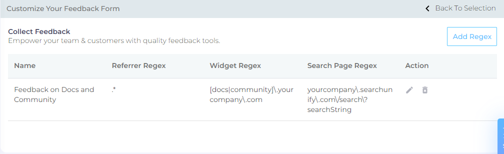 Collect Feedback contains the definitions of traffic source and pages on which feedback widget will be displayed. You can use Add Regex to insert multiple traffic sources and pages for feedback. To delete a regex expression, use the Delete function in the Action column. However, it must be mentioned that the Delete function doesn't work if there is only one regex expression in the Collect Feedback table.
