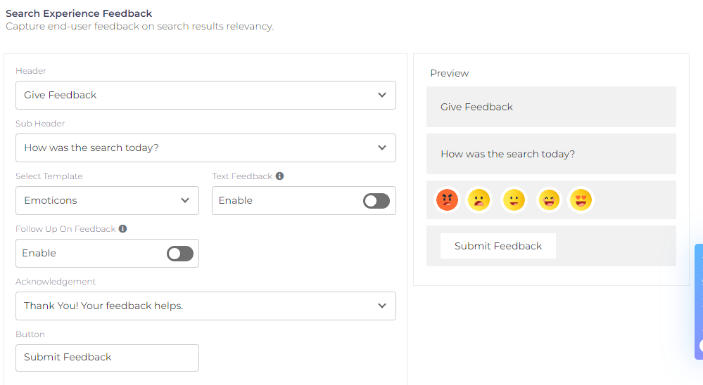Text Feedback allows end-users to do more than just rate their experience with a simple click. It allows them to write detailed responses which are shared with all the admins of a SearchUnify instance. The feature is disabled by default.