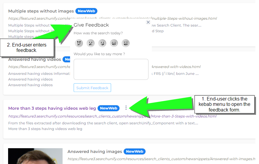 The widget asks for feedback only after an end-user has clicked at least one result. The clicked results turn orange and a kebab menu appears next to them. The user can click the kebab menu to share feedback.