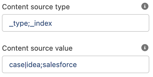 The content source type and Content source value should be orderly aligned. It means that _type should have values case or idea and _index should have values salesforce.