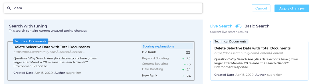 To make comparison easier, the right section offers two search result feeds: Live Search and Basic Search. The first compares boosted results on the left with the results on your production search client. The second compares the boosted results on the left with a hypothetical scenario when no boosting is applied.