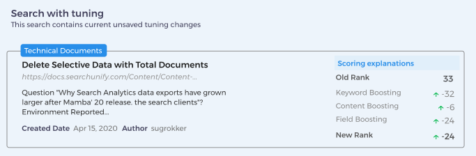 The documents in the left section are the boosted results. You can find the position of documents before boosting in Old Rank and boosted position in New Rank. The contribution of each factor is sandwiched between these two.