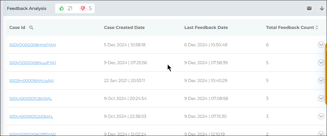 This column shows the count of feedback shared on that particular case. Since the feedback system is available on more than one feature in Agent Helper, the count could possibly be greater than one, in the report as well.