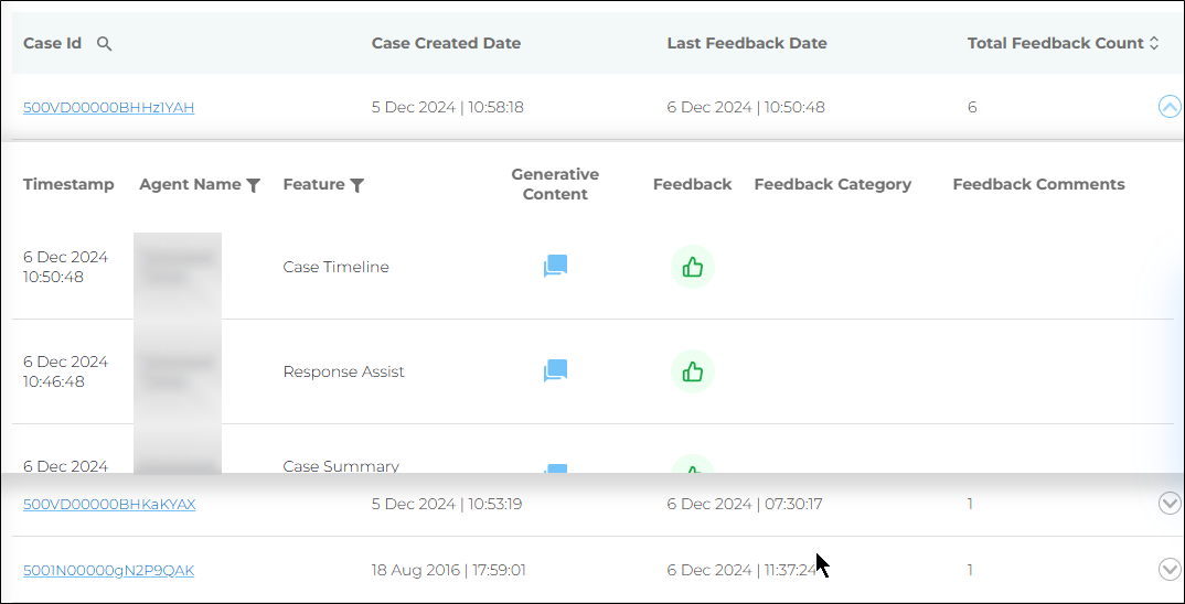 You can expand the case details to see the details of each feedback shared on the case. There are seven columns in this report (as shown in the image below):