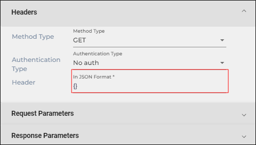 - Write all the key-value pairs to be used in Header in JSON. If you want to keep the field empty, write a pair of curly braces ({}).