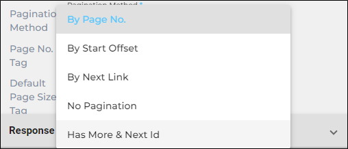 - By Page No. Almost no platform returns data in a single go. That means a caller will have to make multiple calls to get all the documents and each call will be slightly different. The difference is usually a field in your query parameter which has to be selected in the Page No. Tag dropdown. Page No. Tag appears when you select By Page No. as your pagination method. It gets incremented with each call and fetches a new batch of documents each time it is run. Default Page Size Tag—which also appears when you select By Start Offset—determines the size of each page. If the value of its parameter is 10, then there will be 10 results on each page.